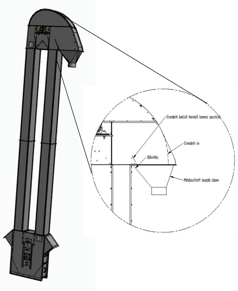 Az elevátorfej külső homloklemezénen, valamint belső terelőlemezének és a leadóidom együttes módosítása
