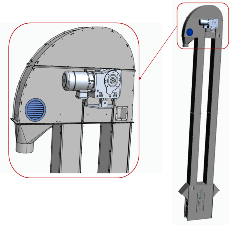 A kedvezőtlen nyomásviszonyokat úgy kezeltük, hogy az elevátorfej mindkét oldallemezére szellőző rácsot méreteztünk. A két szellőzőrács alkalmasnak bizonyult arra, hogy az elevátorfejben a túlnyomást megszüntessük, a visszaforduló turbulenciát – és ilyen formában a szennyezők lerakódását – szignifikánsan csökkentsük.